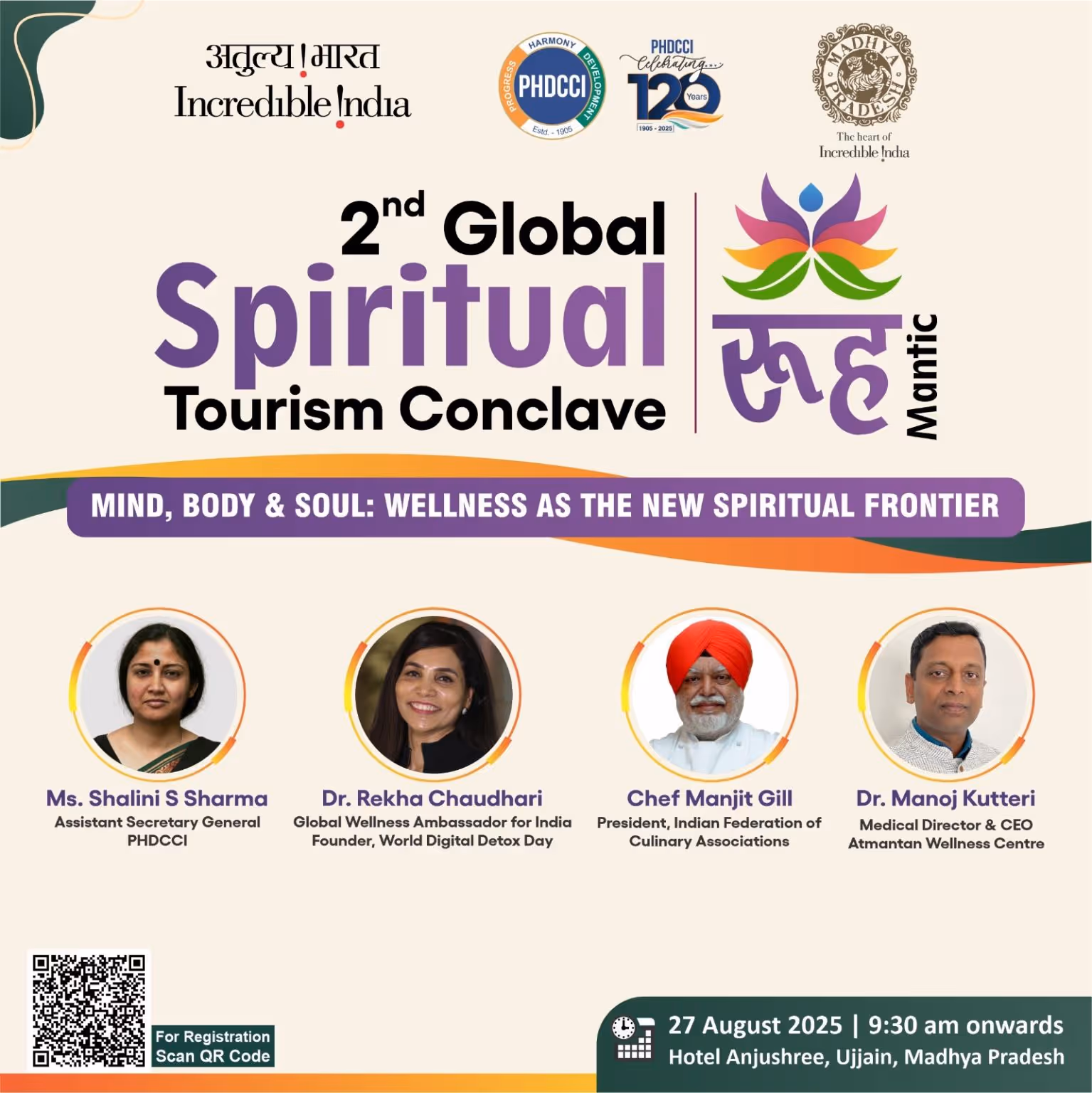 Following the resounding success of the inaugural Global Spiritual Tourism Conclave in Ayodhya (August 2024), PHDCCI hosted the 2nd edition of the Conclave on 27 August 2025 in the sacred city of Ujjain, Madhya Pradesh under the theme रूहmantic.